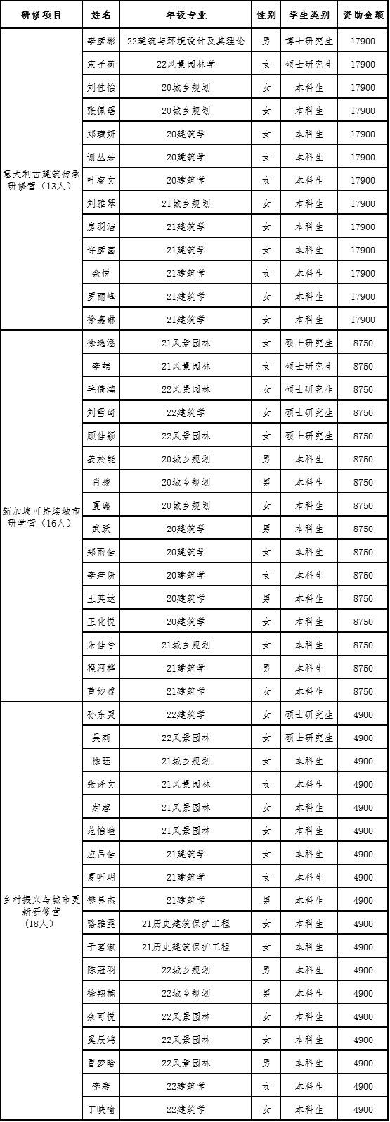 根据《苏州大学金螳螂建筑学院学生暑期专业研修奖学金实施细则》,经学生申请,院学生暑期专业研修奖学金评审小组审查、讨论决定,拟给予以下48名同学不同额度的奖学金资助,具体名单如下: