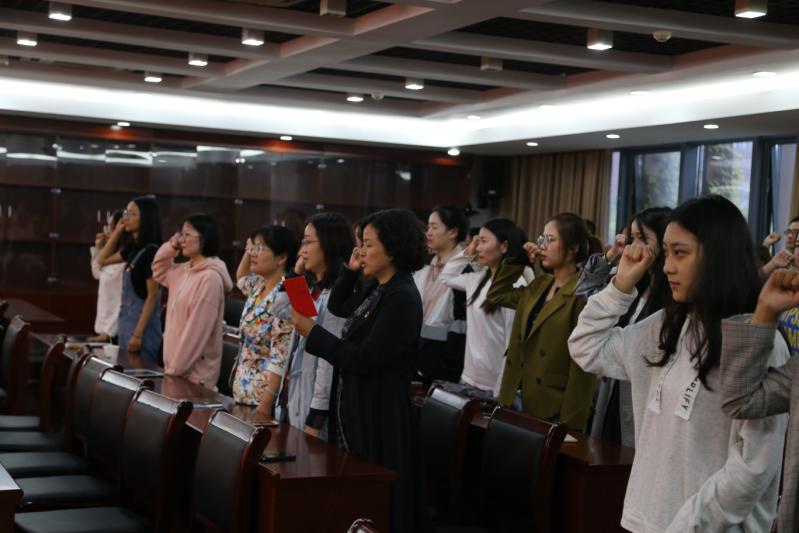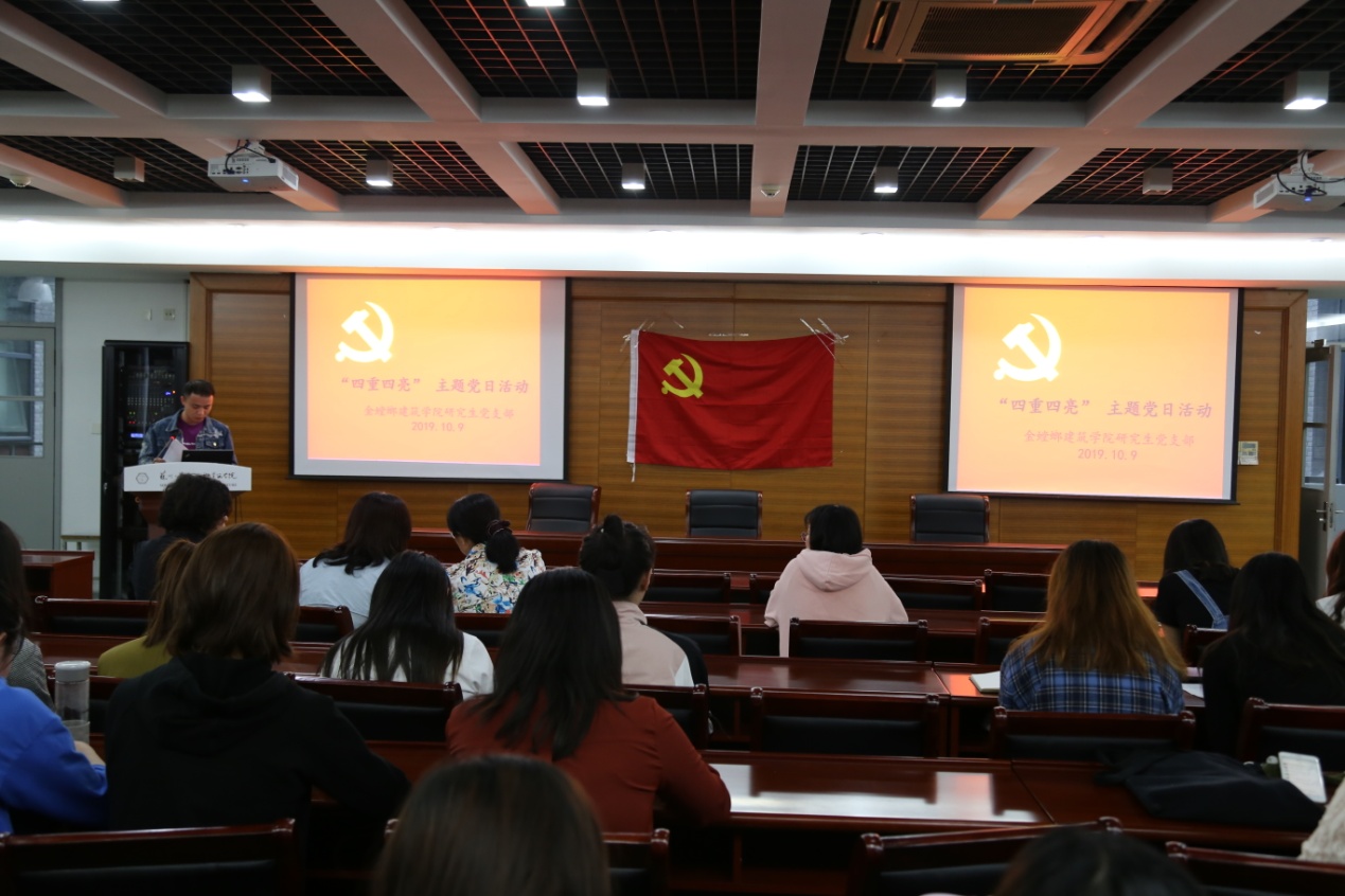 观影结束后,党支部组织了“不忘初心、牢记使命”以及“四重四亮”主题教育活动,首先由研究生党员代表施豪、袁泽彬、梁俊峰等五人上台分享他们的入党志愿,讲诉他们的入党故事与成长历程。在党员代表分享入党初心之后,每位学生党员重读《入党志愿书》 ,志愿书中每一句真诚质朴的语句都流露出对党的忠诚、热爱和信念。接着,全体党员佩戴徽章,在陈国凤书记的带领下向党旗宣誓,用字字铿锵的誓言激发全体党员不断进取、终身奋斗的决心。
