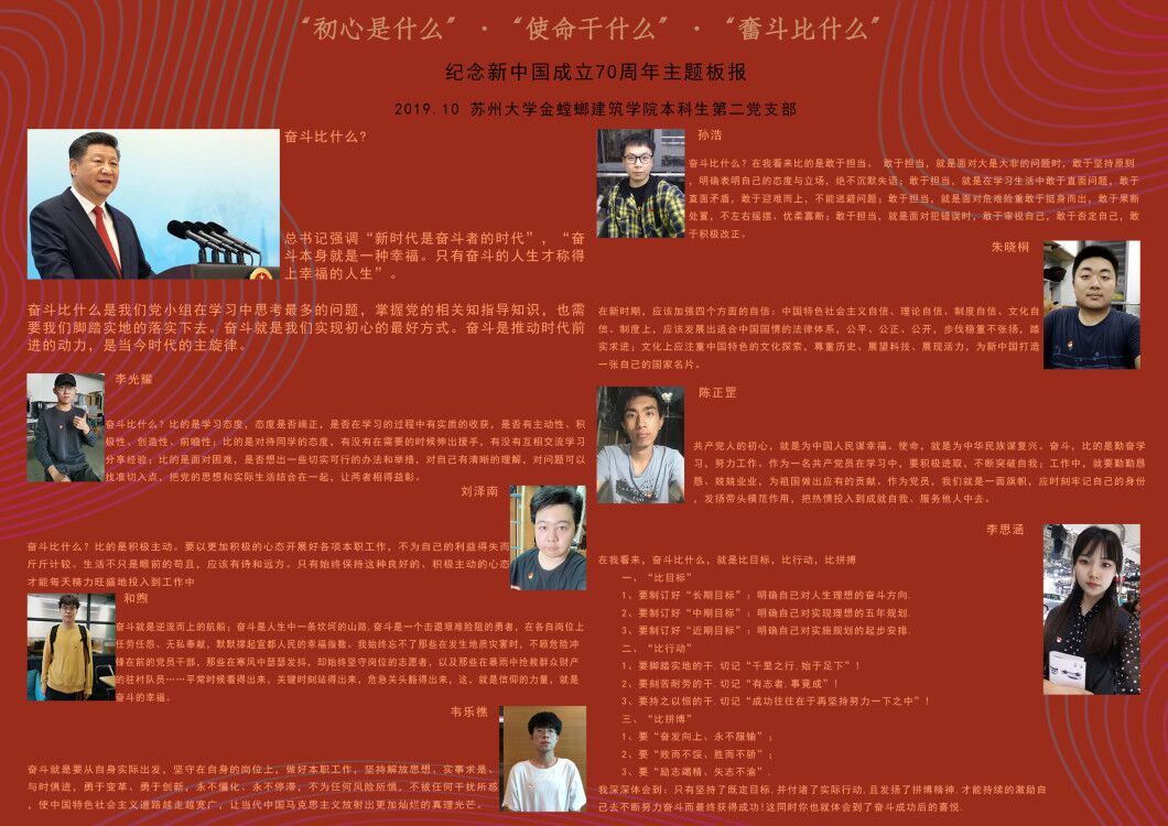 建筑学党支部、风景园林党支部以观看电影《我和我的祖国》为契机,结合如何办好人民满意的教育、推动学校改革发展和“双一流”建设实际,认为教师的初心就是教书育人、为人师表,做一名有理想信念和扎实学识的好老师;使命就是落实立德树人,秉承院训和教风,为社会培养更多优秀的建筑学人才;奋斗就是在自己的工作岗位上保持昂扬向上的精神状态,砥砺奋斗,担当作为。本科生第一党支部、第二党支部以党小组的形式分专题进行讨论,对标党的根本宗旨,联系党的革命传统和光辉历史,结合学习赵亚夫精神、王继才精神,查阅资料、集体讨论、总结提炼,并发挥设计专业专长制作主题板报,在主题党日活动上进行了展示交流,后期将张贴在学业宣传栏供师生党员观摩。学院全体党员领导以普通党员身份,参加了所在党支部组织的专题讨论。