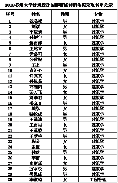 2018苏州大学建筑设计国际研修营招生拟录取名单公示