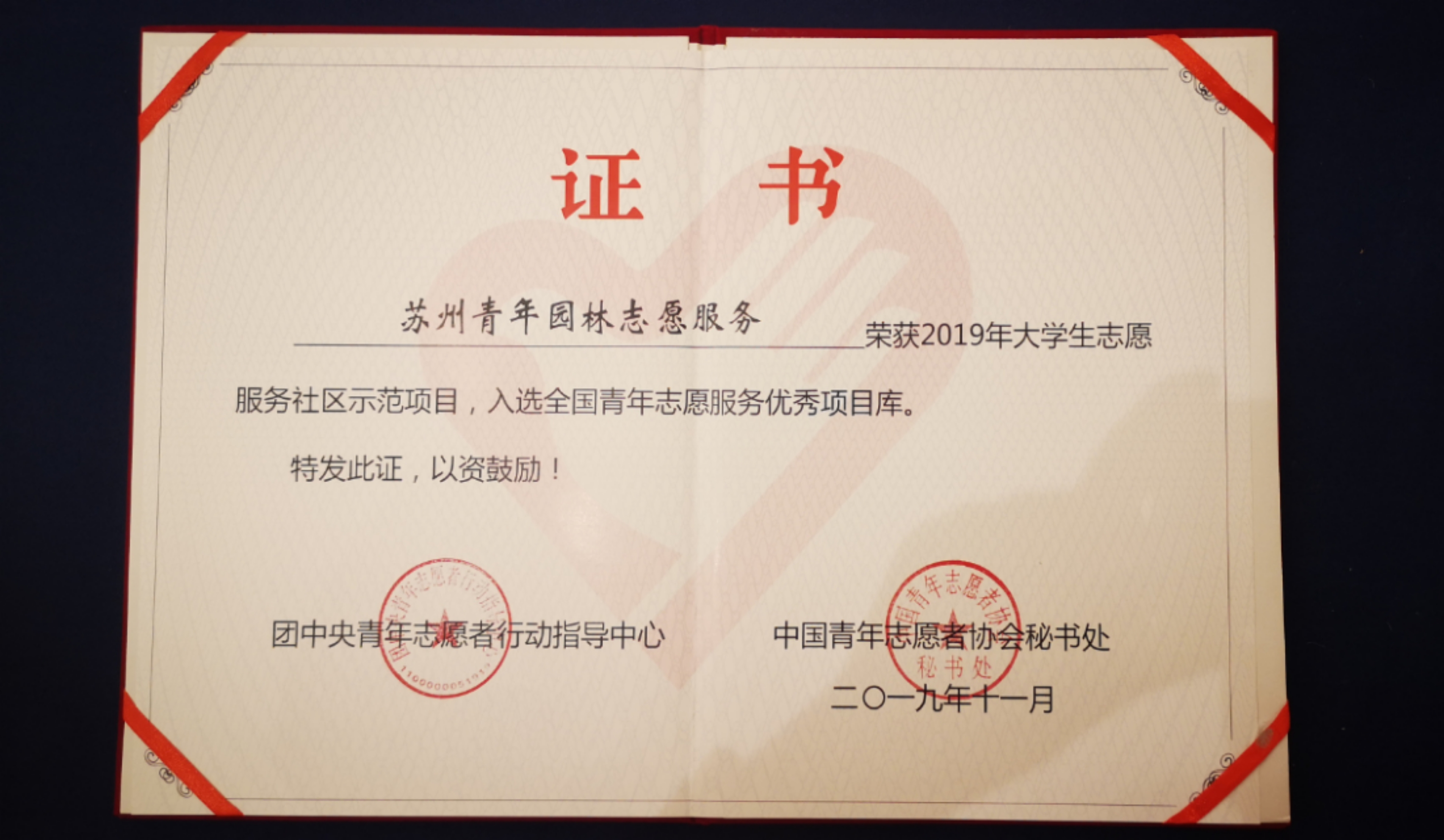苏州青年园林志愿服务项目创立于2009年,秉承着“弘扬志愿服务精神,助力文化遗产保护”的宗旨,连续10年,招募青年大学生在传统节假日走进拙政园、狮子林、网师园等苏州古典园林进行卫生维护、秩序疏导、景点讲解、文明旅游提醒等义务活动,用专业视角展现文化遗产风韵,传递青春正能量,累计4600多人次,总时长达31500小时。2019年5月18日,金螳螂建筑学院为“苏州青年园林志愿服务”项目隆重举办了十周年庆,10年传承人齐聚母校共谋活动再创新辉煌。该项目先后荣获第四届苏州市青年创益杯三等奖、创慧湖杯第三届苏州独墅湖全国大学生创业大赛巾帼创新奖、2018年度苏州大学五四青年奖.向上向善好青年(群体)、2018年度苏州大学标兵宣讲团、2019年苏州大学王晓军精神文明奖等荣誉,苏州日报、姑苏晚报等媒体广泛关注,央视新闻频道用时2分40秒进行了专题报道。