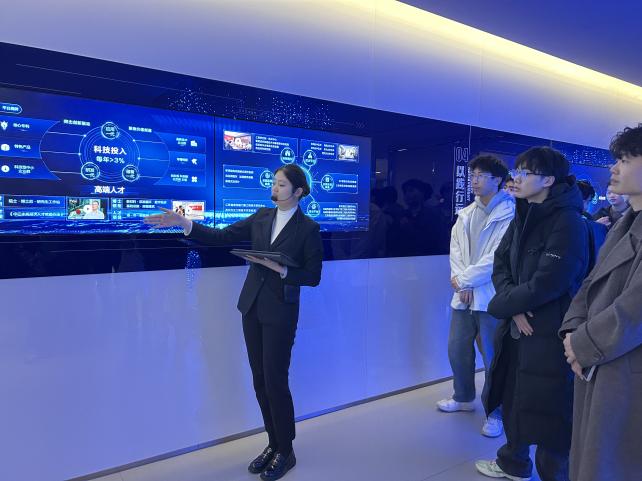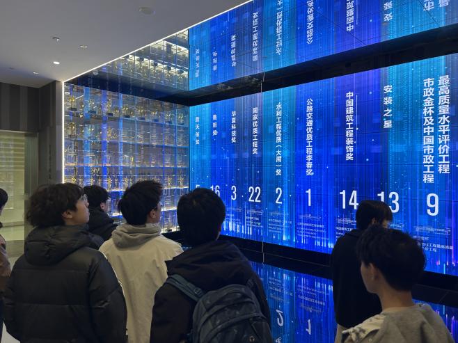 在企业展厅,讲解员以项目文化墙为起点,结合同学们在课堂中所学的设计流程与工程管理知识,系统介绍了集团战略中与建筑专业密切相关的资源整合模式。在重点工程案例展板前,同学们对照《建筑设计基础》课程内容,细致分析实际项目在空间布局、形态设计上的处理手法,探讨功能需求与美学表达之间的平衡。通过交互大屏动态呈现的“云劳务、云集采、云设备”等建筑产业互联网平台,课堂上抽象的施工管理与要素调度概念变得清晰可视。不少同学结合课程设计中遇到的施工组织问题,与讲解员交流数字平台在进度控制与成本优化中的具体应用。