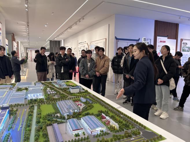 展厅内,古建筑模型与智能施工装备并置展示,盾构、顶管等工艺的实物模型,生动呈现了数字智能技术对传统工艺与现代工程的赋能效果。在项目沙盘区,师生围绕按比例还原的园区模型,就空间布局、功能规划等展开讨论。同学们积极提出“商业综合体与社区衔接”“绿色技术落地途径”等与课程相关的问题,与讲解员共同探讨实际项目中设计策略的优化可能,将课堂理论延伸至工程实践现场。随后的荣誉展示区,“鲁班奖”“国家优质工程奖”等行业重要奖项,让同学们切身感受到行业高标准的意义,进一步坚定了专业学习的信念。