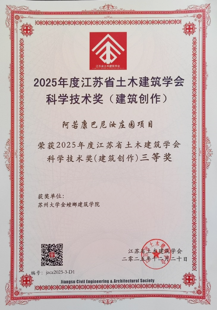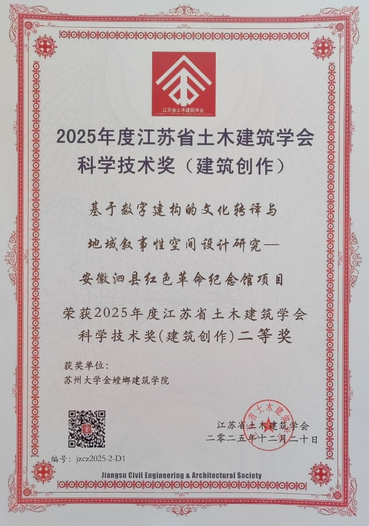 2025年12月19-21日“江苏省土木建筑学会建筑创作专业委员会2025年学术年会”在常州召开,会议主题为“城市更新与建筑环境高质量发展”。我院教师在2025年江苏省土木建筑学会科学技术奖(建筑创作)、第十九届“建筑创作优秀作品”评选中获得佳绩。