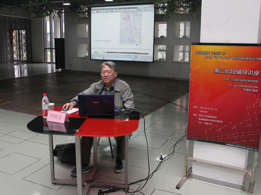 11月2日,“乐思龙”杯第一届“On the Path”苏州市高校建筑设计竞赛第一阶段评审会议暨第二阶段辅导讲座在苏州大学金螳螂建筑与城市环境学院举行,5位资深专家出席第一阶段评审会议,平国安教授为参赛团队代表做第二阶段辅导讲座。