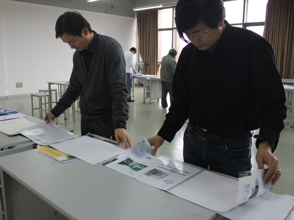 下午1点,苏州大学金螳螂建筑与城市环境学院刘伟教授、余亮教授,苏州大学艺术学院王泽猛教授,苏州工艺美院平国安教授,苏州科技学院董志国老师齐聚参赛作品展览室,对第一阶段的40多份参赛作品进行点评,一起探讨了参赛作品的评分方法与各阶段比分权重。5位评委一致认为,本次参赛作品总体水平较高,选手们都认真进行了实地考察,参阅国内外文献,在指导老师的帮助下进行了较为科学、合理的分析,部分作品还融入了比较好的人文观念与设计理念,涌现出一大批让人眼前一亮的优秀作品;但评委老师同时也指出了部分作品的不足之处,希望可以在后期的设计中进行一些作品完善,创新设计理念,深入挖掘设计背后的东西。
