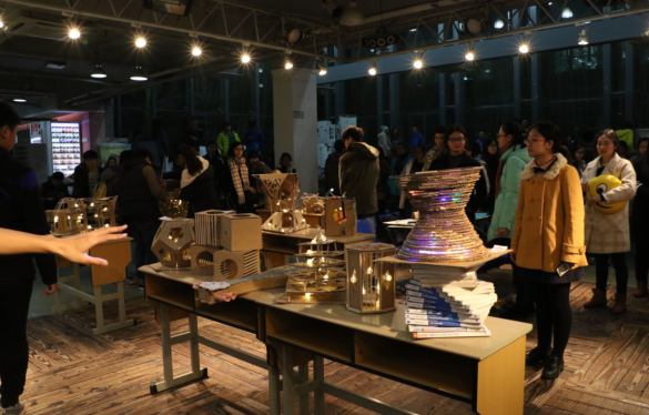 很快,活动开始了,在主持人介绍完材料背景相关流程后,活动的第一阶段小组讨论构思持续了十分钟,之后小组间协商互换材料。一切就绪后,每个组都开始了全身心制作。活动还设置了熄灯环节,使同学们更好的将光与影融合模型。