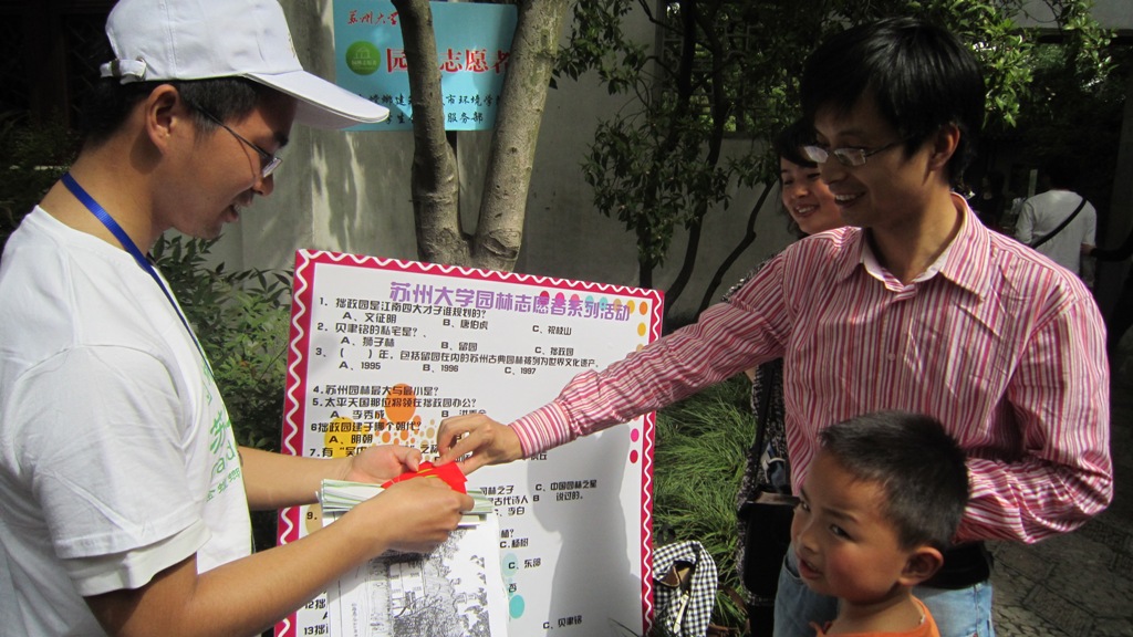 此次活动的志愿者来自苏大的各个学院与各个年级,活动一开始就吸引了近200名志愿者报名参加,经过一系列面试挑选之后84人正式成为苏州园林志愿者,在4月30日到5月2日这三天分别在上述四大园林内轮流上岗服务,分别担负起园林讲解与导游、辅助检票、园林卫生与秩序维护等工作。另为了宣传园林文化,倡导保护古建和文化遗迹,本次活动还设立了“苏州文化竞答”有奖活动。