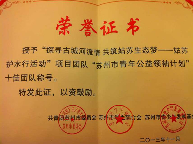 由于护水行团队每一位成员的不懈努力和追求,由苏州大学团委和苏州团市委共同推荐,苏州大学绿色协会“探寻古城河流情,共筑姑苏生态梦—姑苏护水行活动”项目团队终荣获“苏州市青年公益领袖计划十佳优秀团队”奖项。