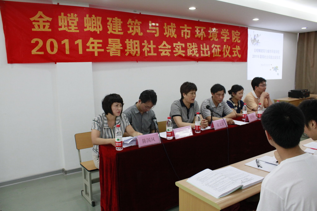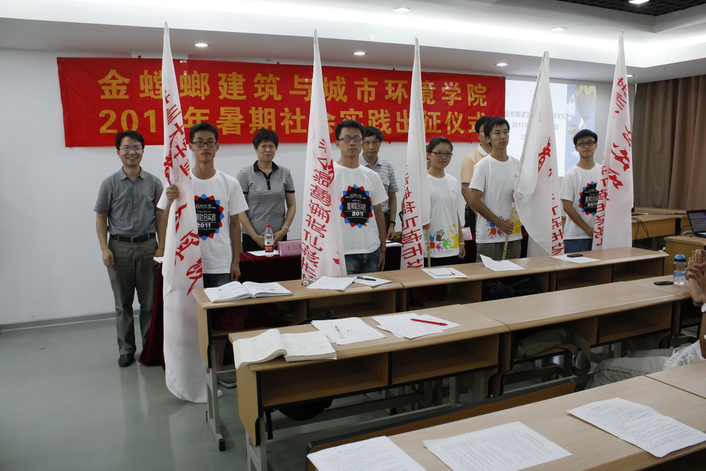 在激昂的音乐声中,与会领导为金螳螂建筑与城市环境学院5支校级示范团队授旗,为他们出征送行!这标志着着金螳螂建筑与城市环境学院2011年暑期社会实践活动正式拉开帷幕!