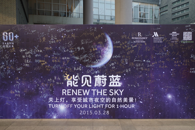 “地球一小时”是世界自然基金会在2007年发出的一项倡议:呼吁个人、社区、企业和政府在每年3月23日熄灯1小时,以此来激发人们对保护地球的责任感。今年,为了呼应当前苏州最急迫、最受关注的环境议题——雾霾,传递环保正能量,苏州大学绿色协会携手苏州万豪酒店联盟开展“能见蔚蓝”地球一小时系列活动,通过地铁快闪,环保骑行,校园不插电演唱会,呼吁市民和学生“关爱地球,解放苍穹”。