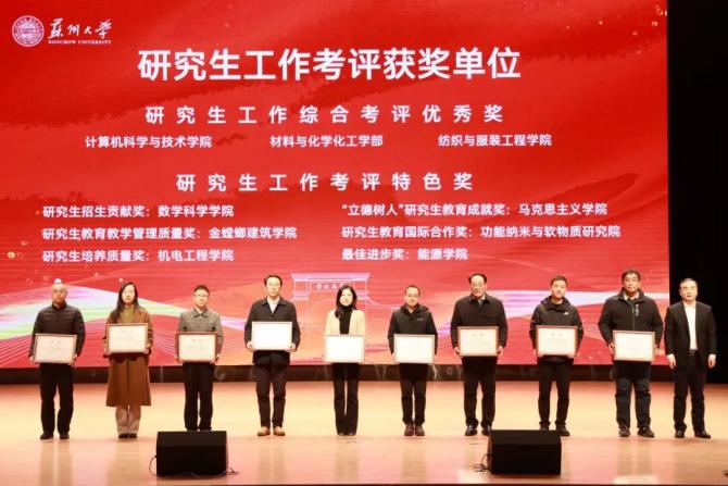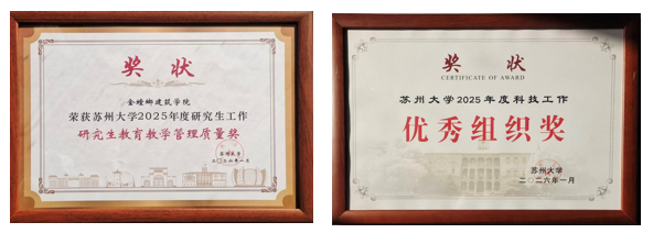 2026年1月11日,苏州大学2025年度教学与科研工作总结大会在存菊堂隆重举行。在这场汇聚全校智慧与成果的盛会上,金螳螂建筑学院研究生教育工作、科研工作双双获得学校肯定,分别荣获“苏州大学2025年度研究生教育教学管理质量奖”与“苏州大学2025年度科技工作优秀组织奖”,是学院办学史上的首次“双喜临门”,展现了学院发展的新突破。