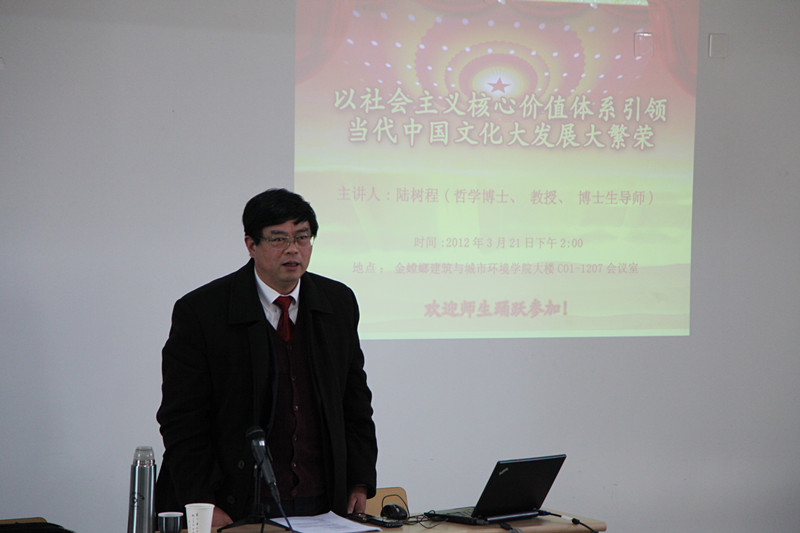 陆树程教授通过党的十七届六中全会以文化建设为主题的三个主要原因详细阐述了什么是社会主义核心价值体系、什么是文化、中国特色社会主义文化方向,分析了社会主义核心价值体系与当代中国文化大发展大繁荣的辨证关系及国内国际形势,对党的十七届六中全会精神进行了全面而深刻的诠释。陆教授的报告理论联系实际,语言生动活泼,内涵丰富,具有很强的感染力,赢得了与会师生的热烈掌声。