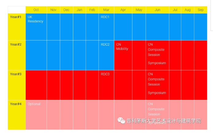 在课程的三年期间,所涉及活动的明细如下所示:(蓝色为首18个月的驻留期,红色为后18个月的交流期)