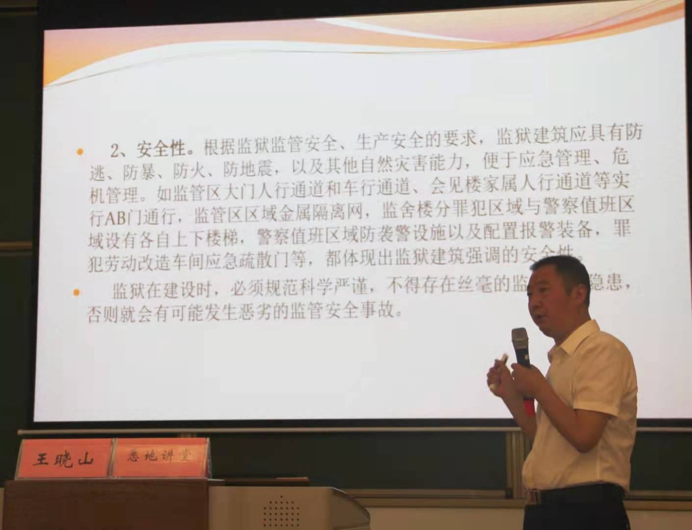 王晓山研究员以图片为主要形式,用生动的语言为同学们介绍了监狱设计建造中的建筑学原理,丰富了同学们的知识,开阔了同学们的眼界。