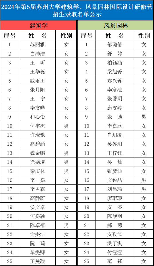 2024年第5届苏州大学建筑学、风景园林国际设计研修营录取名单公示