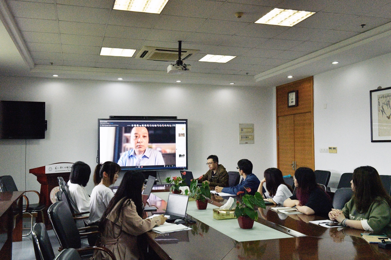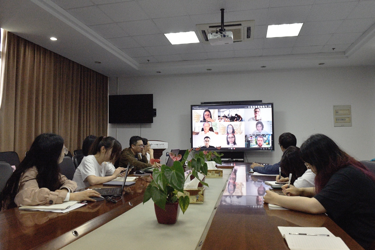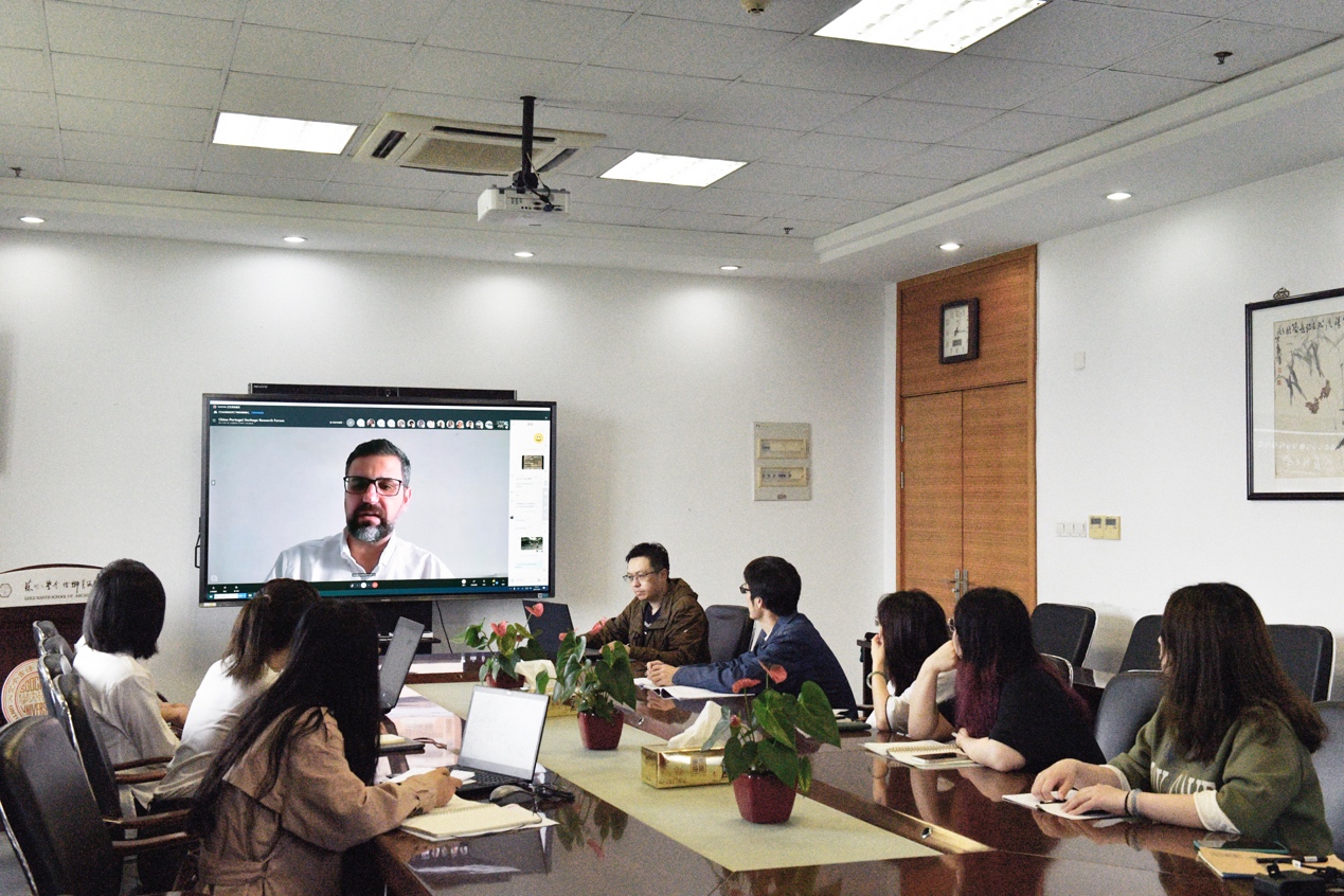 提问互动环节中,论坛现场学术氛围活跃,我院线下会议室(金螳螂建筑学院)师生向线上(Skype会议)参会学者踊跃提问,积极互动。我院王彪副教授与澳门城市大学孟静文博士候选人就中国和葡萄牙文化相似性进行深入探讨。我院黄巍博士候选人与葡萄牙埃武拉大学博士候选人Miriam PRESSATO就保存在葡萄牙的17世纪中国装饰墙纸的生活场景叙事与历史价值进行讨论交流。