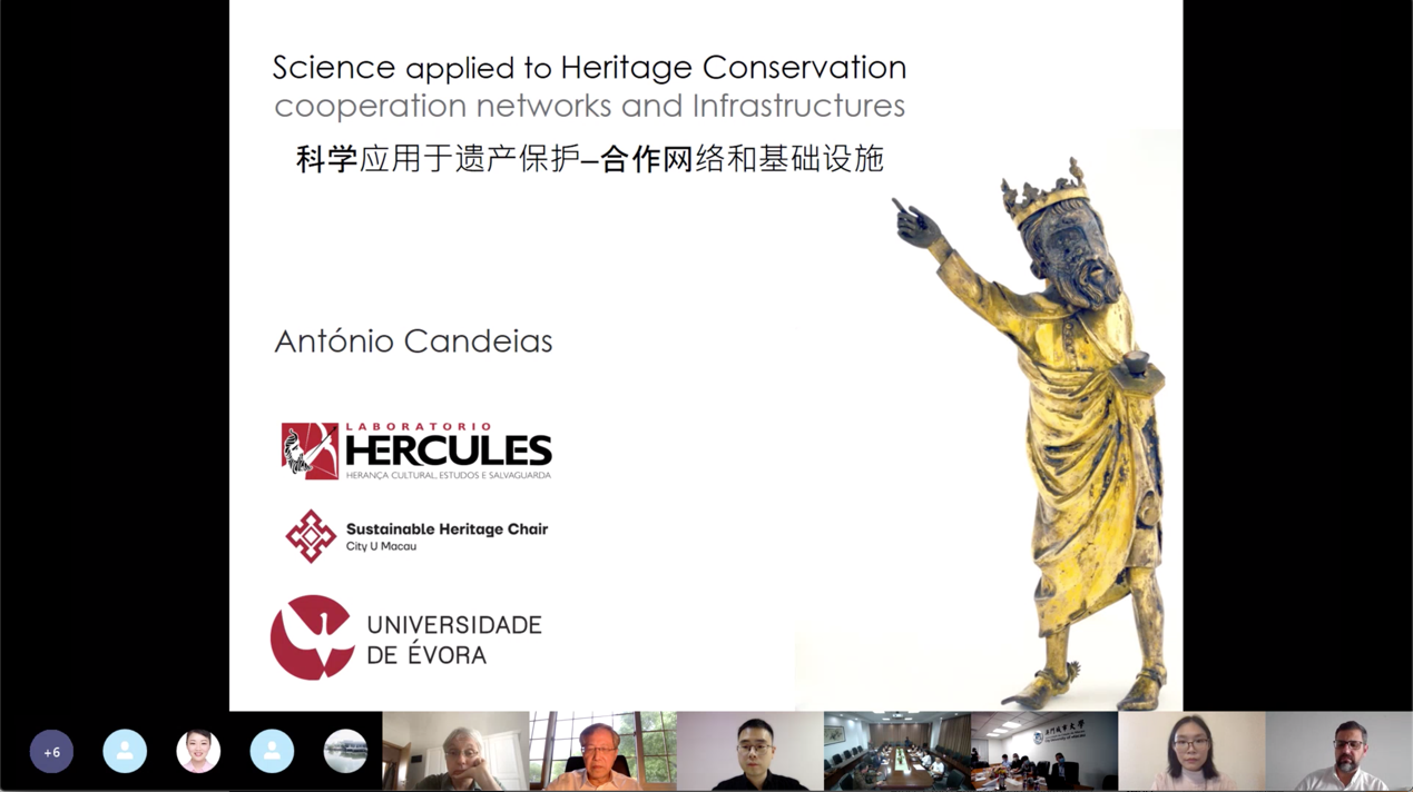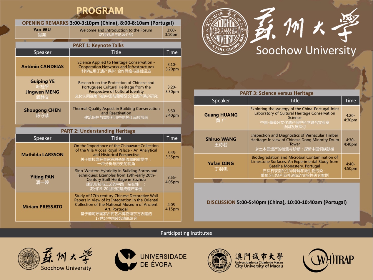 葡萄牙埃武拉大学副校长António CANDEIAS教授以“科学应用于遗产保护:合作网络与基础设施” 受邀出席论坛并做主旨报告。来自葡萄牙埃武拉大学HERCULES实验室助理研究员Mathilda LARSSON以“关于维拉维萨皇家宫殿瓷器收藏的重要性:一种分析与历史的视角” 为题做报告分享。葡萄牙埃武拉大学HERCULES实验室的博士候选人Miriam PRESSATO以“基于葡萄牙国家古代艺术博物馆东方收藏的17世纪中国装饰墙纸研究”为题做报告分享。葡萄牙埃武拉大学“ED-ARCHMAT欧盟考古材料科学联合培养”初期研究员Yufan DING (丁羽帆)以“石灰石表面的生物降解和微生物污染:葡萄牙巴塔利亚修道院的实验性研究案例”为题做报告分享。