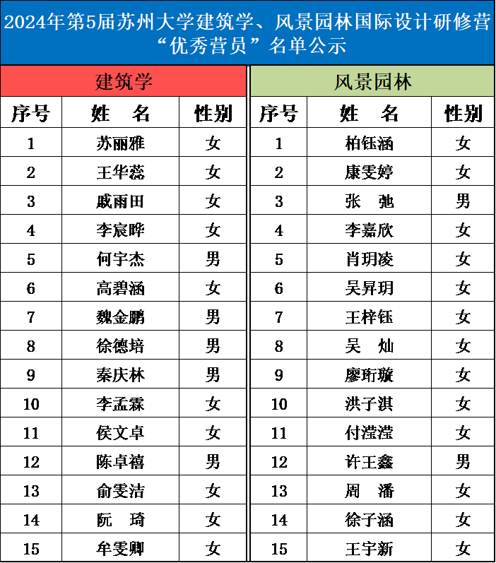 经过7月15日-18日为期4天的研修营活动开展,我院2024年第5届建筑学、风景园林研修营工作顺利完成。现将“优秀营员”名单予以公示,公示期为5个工作日,联系电话:0512-65880208,0512-65883590,联系人:尚老师,李老师。